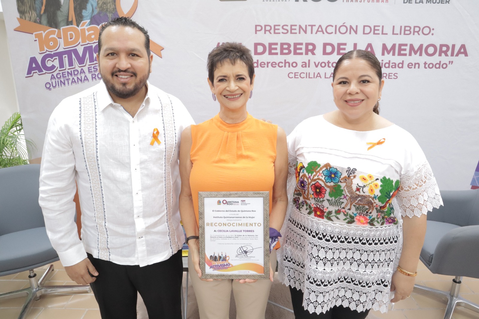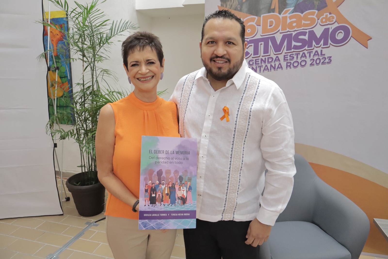 Chetumal, Quintana Roo a 29 de noviembre de 2023.- El Magistrado Presidente del Tribunal Electoral de Quintana Roo, Sergio Avilés Demeneghi y la Magistrada en Funciones, Maogany Crystel Acopa Contreras, asistieron a la presentación del libro “El Deber de la Memoria. Del Derecho al Voto a la Paridad en Todo”, de las autoras Cecilia Lavalle Torres y Teresa Hevia Rocha, en el marco del Día Internacional para la Eliminación de la Violencia contra La Mujer.