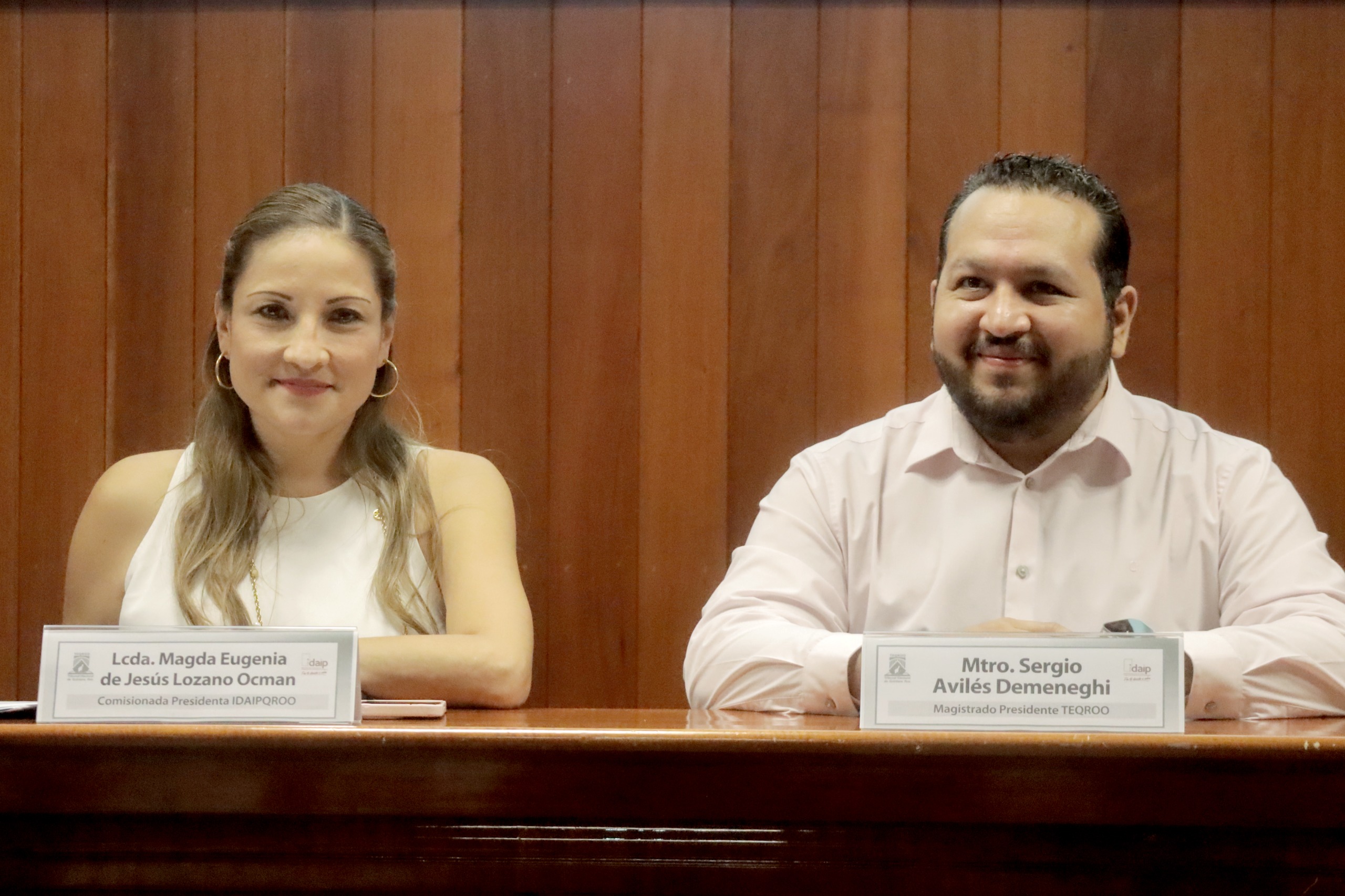 Chetumal, Quintana Roo a 11 de diciembre de 2023.- El Magistrado Presidente del Tribunal Electoral de Quintana Roo (TEQROO), Sergio Avilés Demeneghi y la Comisionada Presidenta del Instituto de Acceso a la Información y Protección de Datos Personales de Quintana Roo (IDAIPQROO), Magda Eugenia de Jesús Lozano Ocman, firmaron un convenio general de colaboración; evento que contó con la presencia de la Magistrada en Funciones, Maogany Crystel Acopa Contreras.
