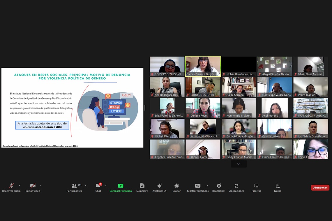 Chetumal, Quintana Roo a 28 de febrero de 2024.- Después de tres sesiones de dos horas diarias, hoy concluyó el curso virtual “Violencia Política contra las Mujeres por Razón de Género en medios de comunicación y redes sociales”, que impartió el Tribunal Electoral de Quintana Roo (TEQROO) y la Sala Regional Xalapa del Tribunal Electoral del Poder Judicial de la Federación (TEPJF).