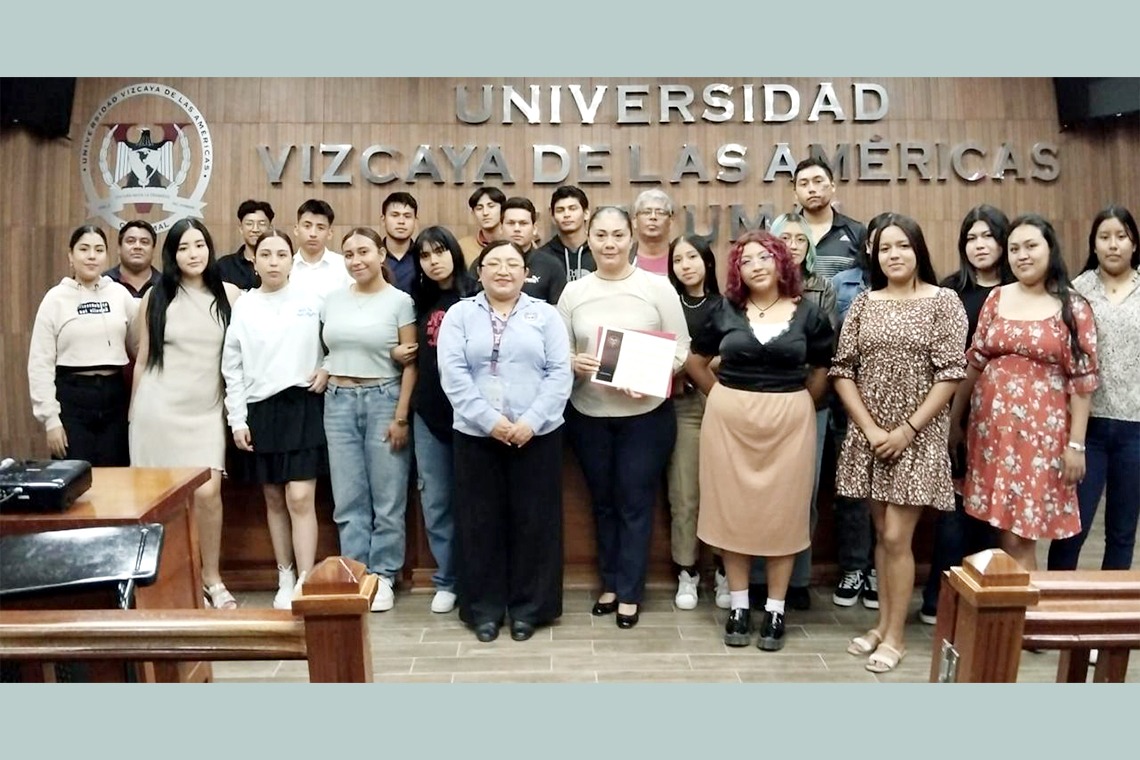 Esta actividad se realizó en la Sala de Juicios Orales y contó con la presencia del Director General de la Universidad Vizcaya de las Américas Campus Chetumal, Juan Gerardo Chan Sonda y Hilda Janet Puc Balam, Coordinadora de las licenciaturas de Arquitectura y Derecho.