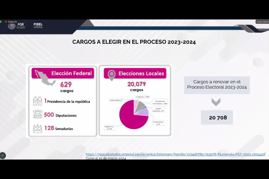 Por su parte la ponente, Ana Patricia Gaytán Tapia, Supervisora Especial de la FISEL informó que en este proceso electoral 2023-2024, se habrán de renovar en la elección federal 629 cargos, entre estos, la Presidencia de la República, 500 Diputaciones y 128 Senadurías; mientras que en las elecciones locales serán 20 mil 079 los cargos, haciendo un total de 20 mil 708 cargos a renovar.