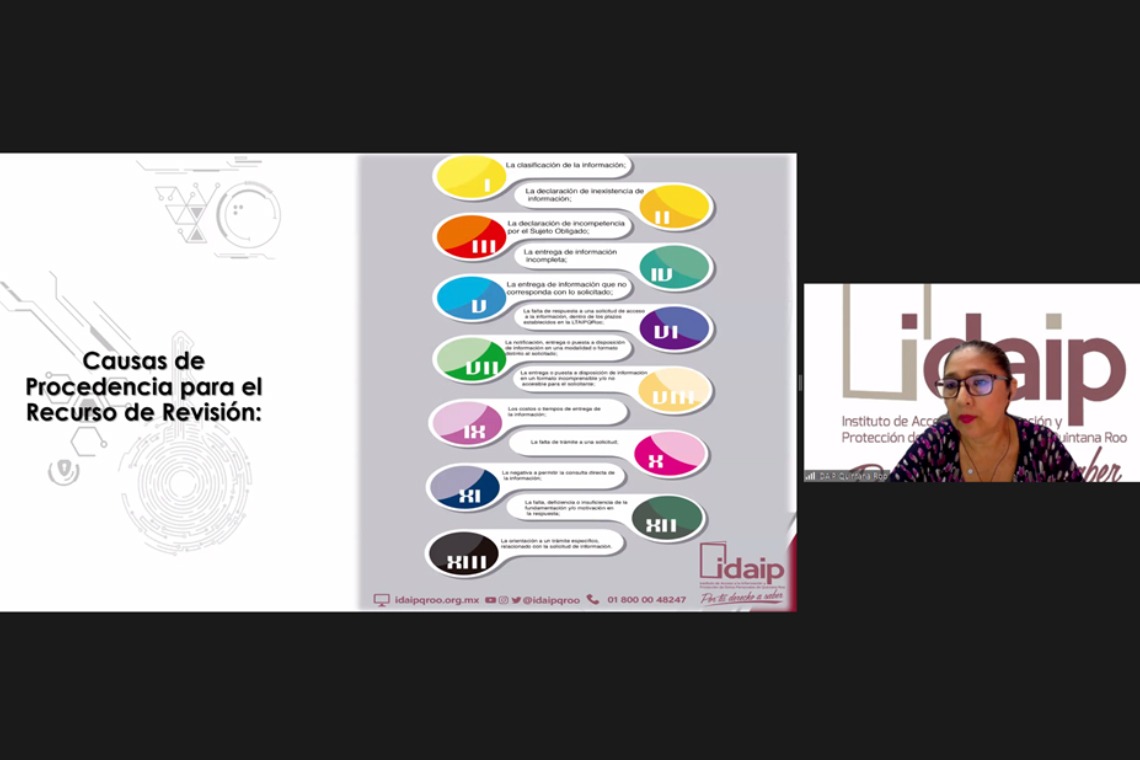 Por lo que, la ponente abordó desde ¿Qué es un Recurso de Revisión?, el Fundamento Legal, ¿Quién puede interponer un Recurso de Revisión?, ¿Ante quién se interpone un Recurso de Revisión?, ¿Cuántos días tiene el solicitante para interponer un Recurso de Revisión?, las Causas de Procedencia para el Recurso de Revisión, los Requisitos del Recurso de Revisión, los Medios y Modalidad para la presentación del Recurso de Revisión, el Plazo para la resolución del Recurso de Revisión, el Cumplimiento de la Resolución, las Medidas de Apremio y las Sanciones.