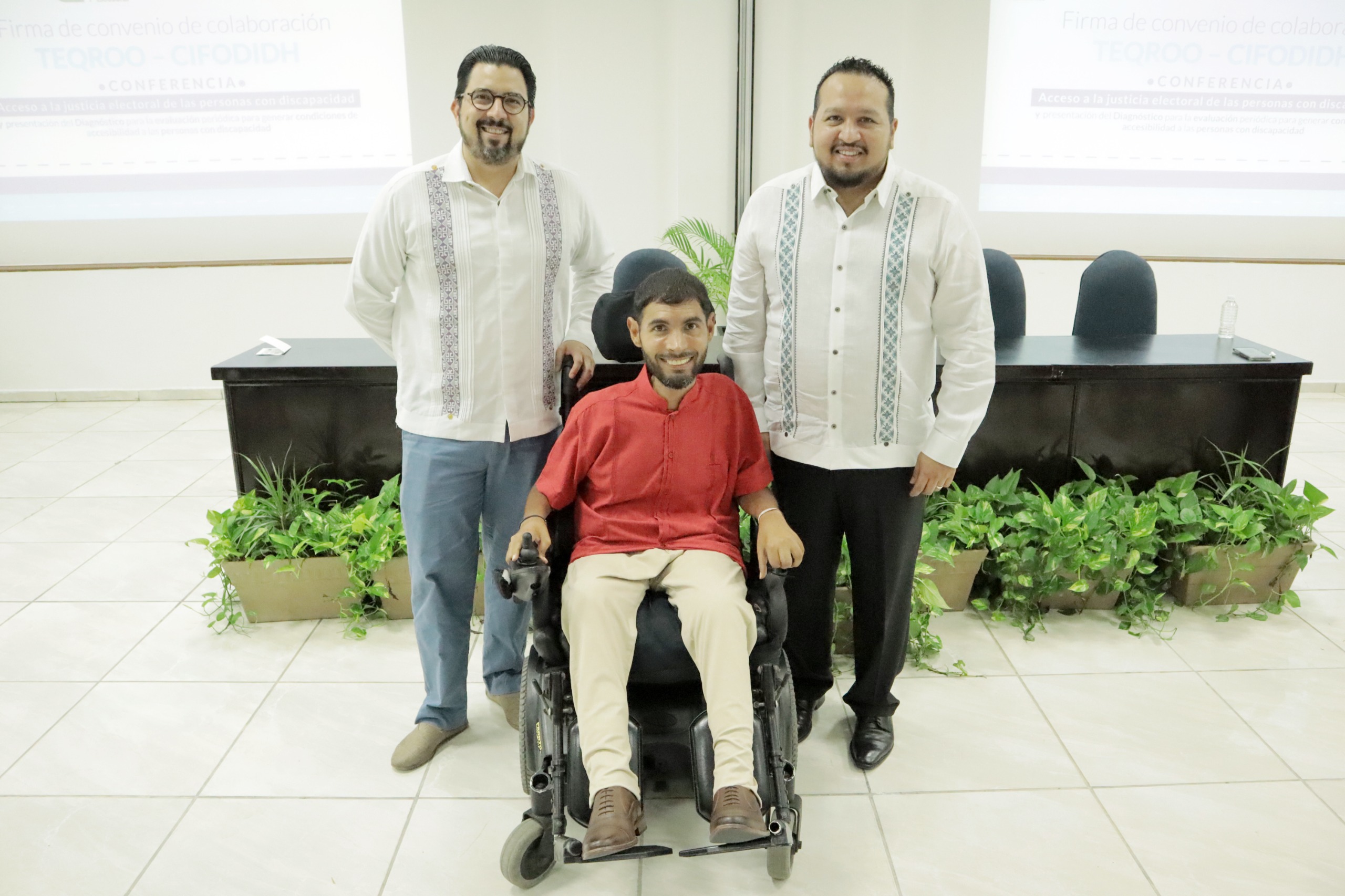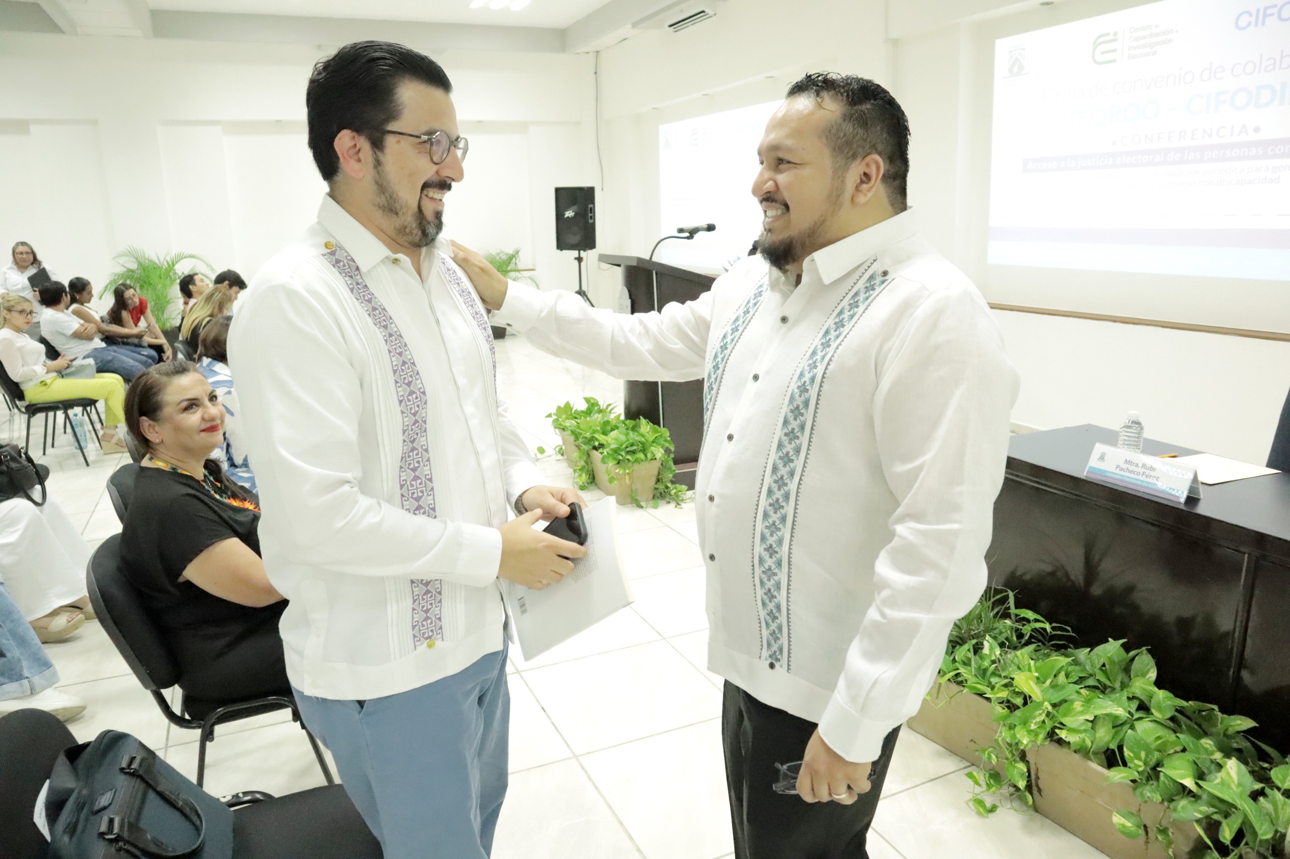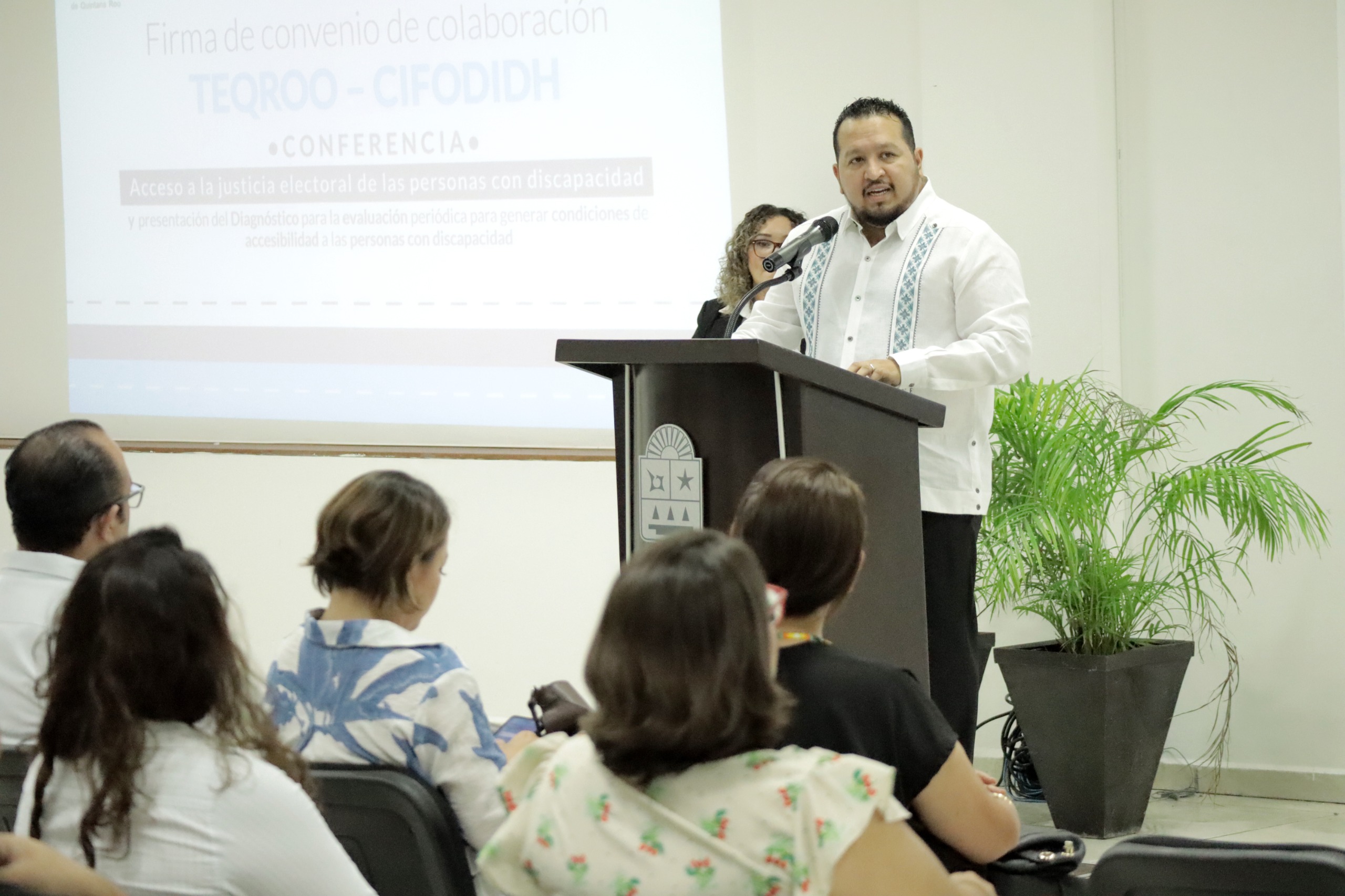 Chetumal, Quintana Roo a 10 de julio de 2024.- En el marco de la presentación del Diagnóstico para la evaluación periódica para generar condiciones de accesibilidad a las personas con discapacidad, se realizó una firma de convenio de colaboración entre el Magistrado Presidente del Tribunal Electoral de Quintana Roo (TEQROO), Sergio Avilés Demeneghi y el Secretario Ejecutivo del Centro Iberoamericano para el Fomento del Derecho Internacional y los Derechos Humanos (CIFODIDH), Adalberto Méndez López y se dictó la conferencia “Acceso a la justicia electoral de las personas con discapacidad”.