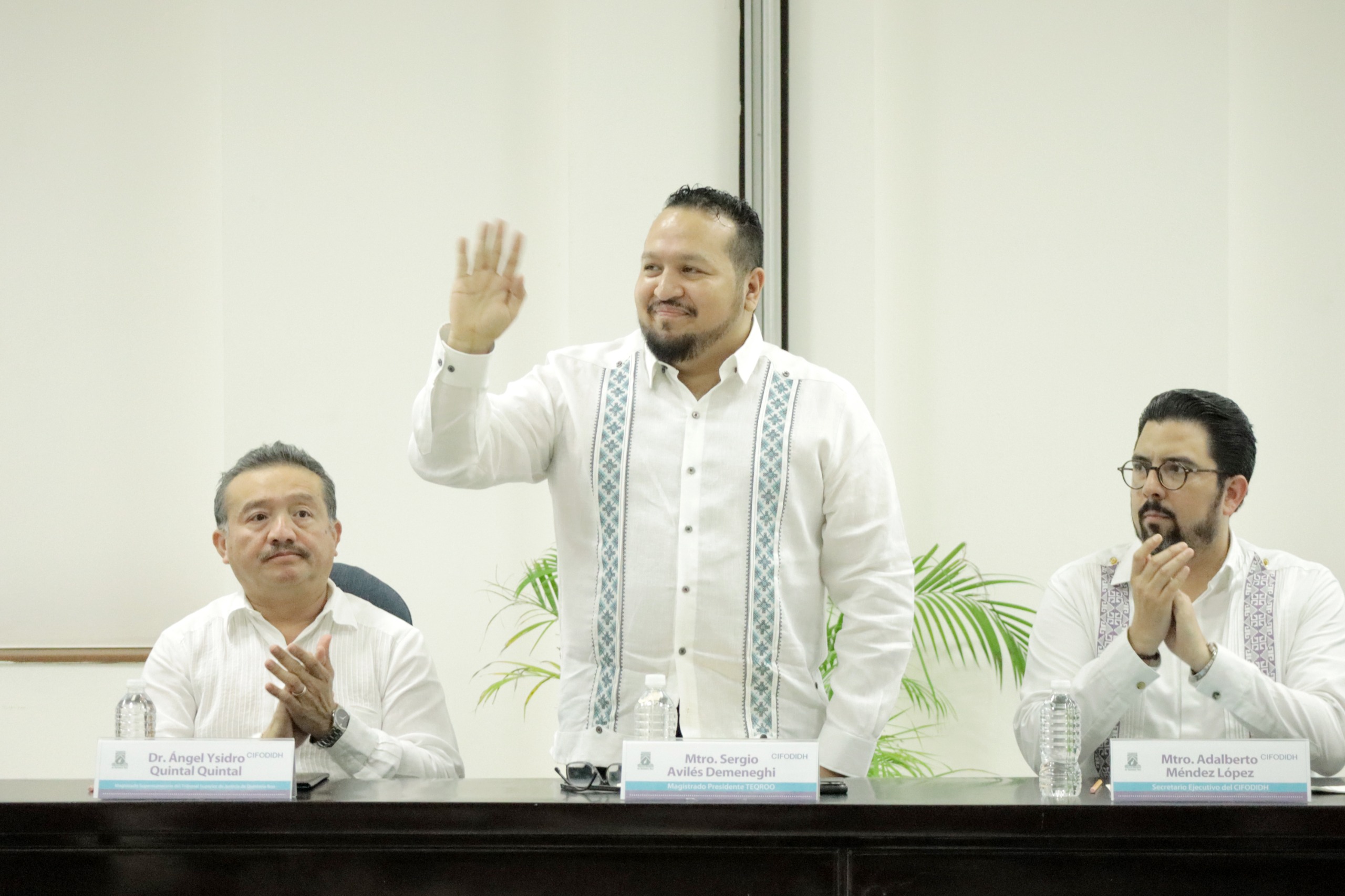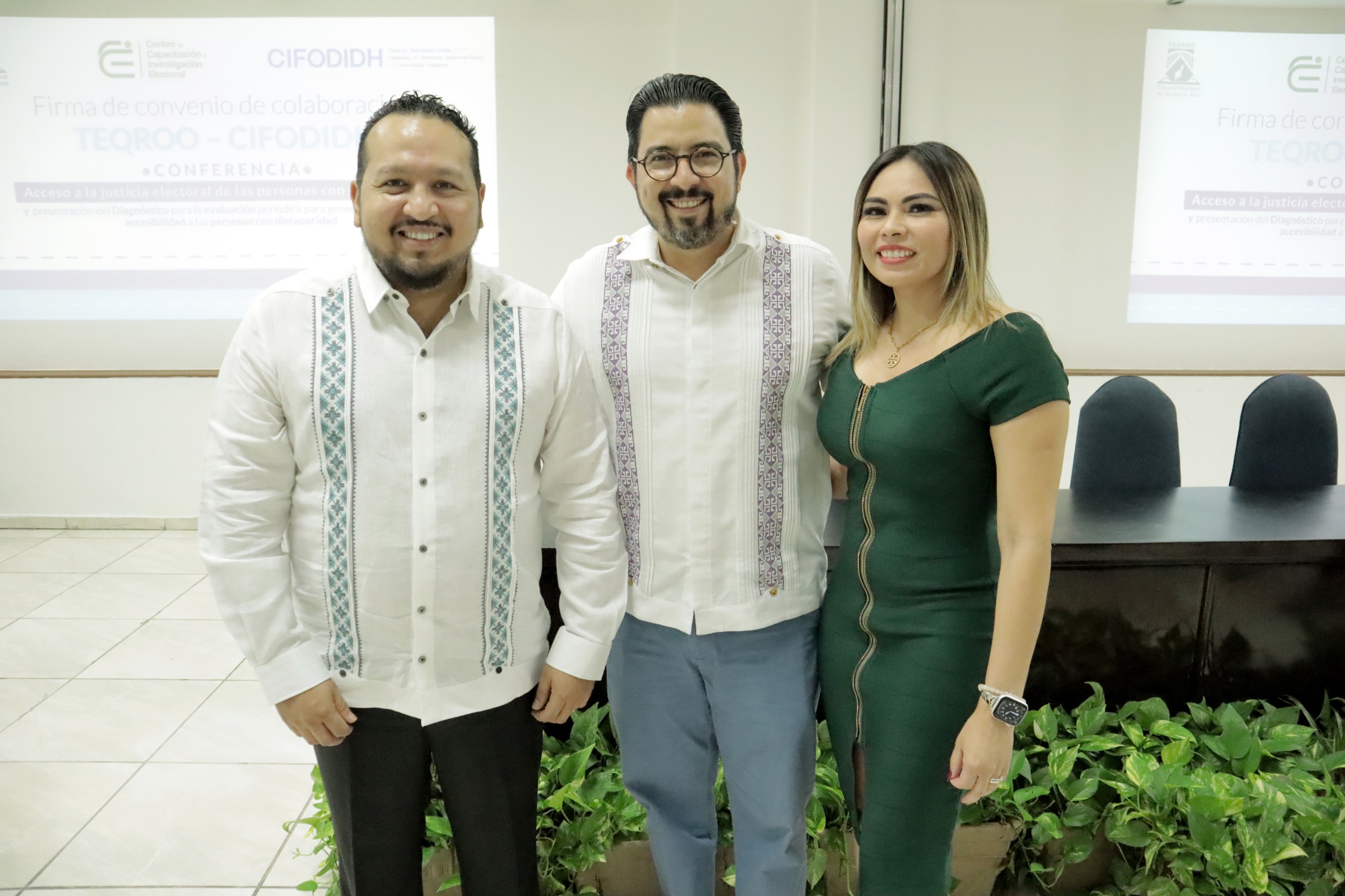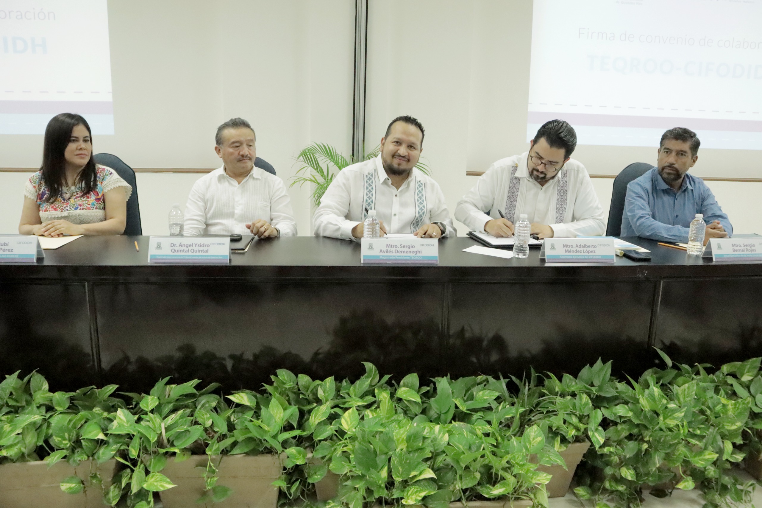 Chetumal, Quintana Roo a 10 de julio de 2024.- En el marco de la presentación del Diagnóstico para la evaluación periódica para generar condiciones de accesibilidad a las personas con discapacidad, se realizó una firma de convenio de colaboración entre el Magistrado Presidente del Tribunal Electoral de Quintana Roo (TEQROO), Sergio Avilés Demeneghi y el Secretario Ejecutivo del Centro Iberoamericano para el Fomento del Derecho Internacional y los Derechos Humanos (CIFODIDH), Adalberto Méndez López y se dictó la conferencia “Acceso a la justicia electoral de las personas con discapacidad”.