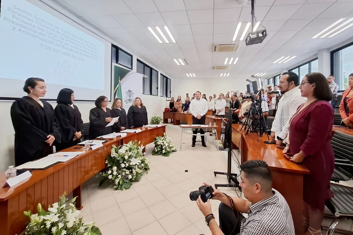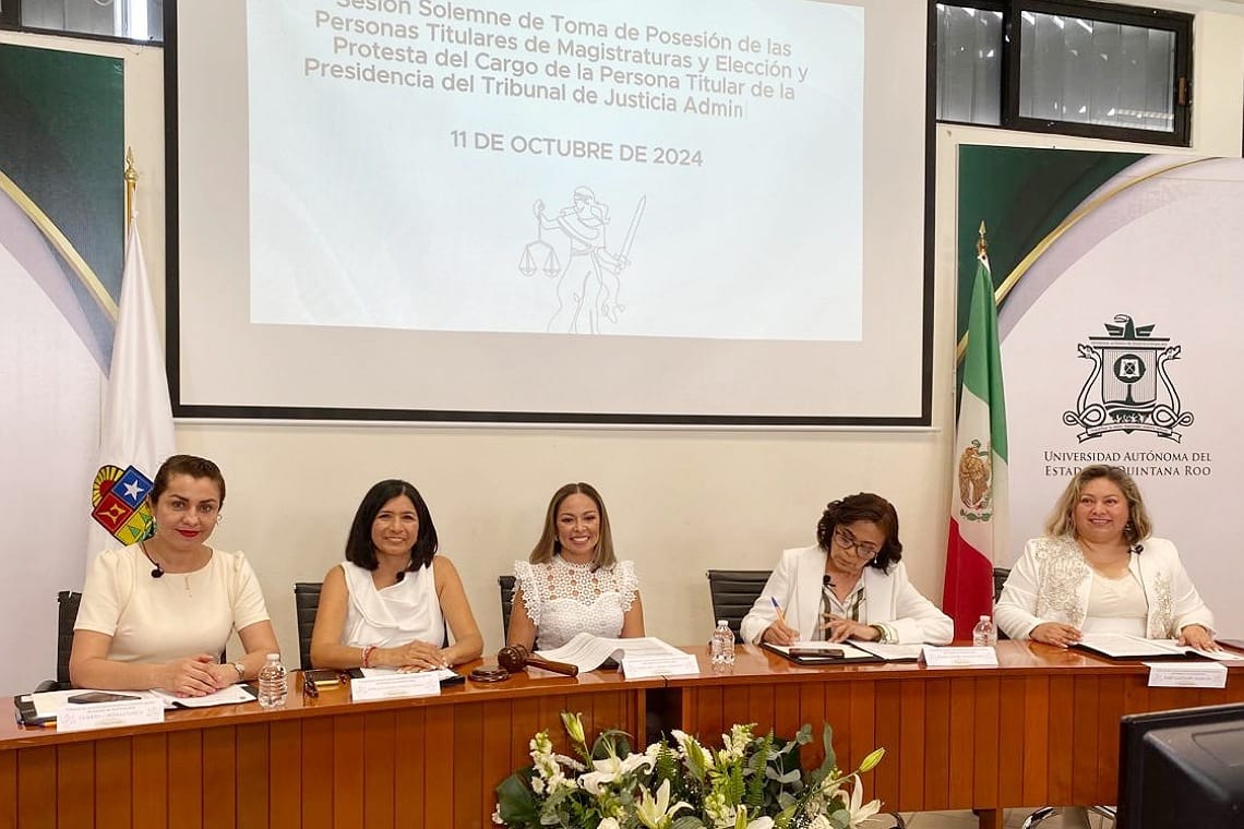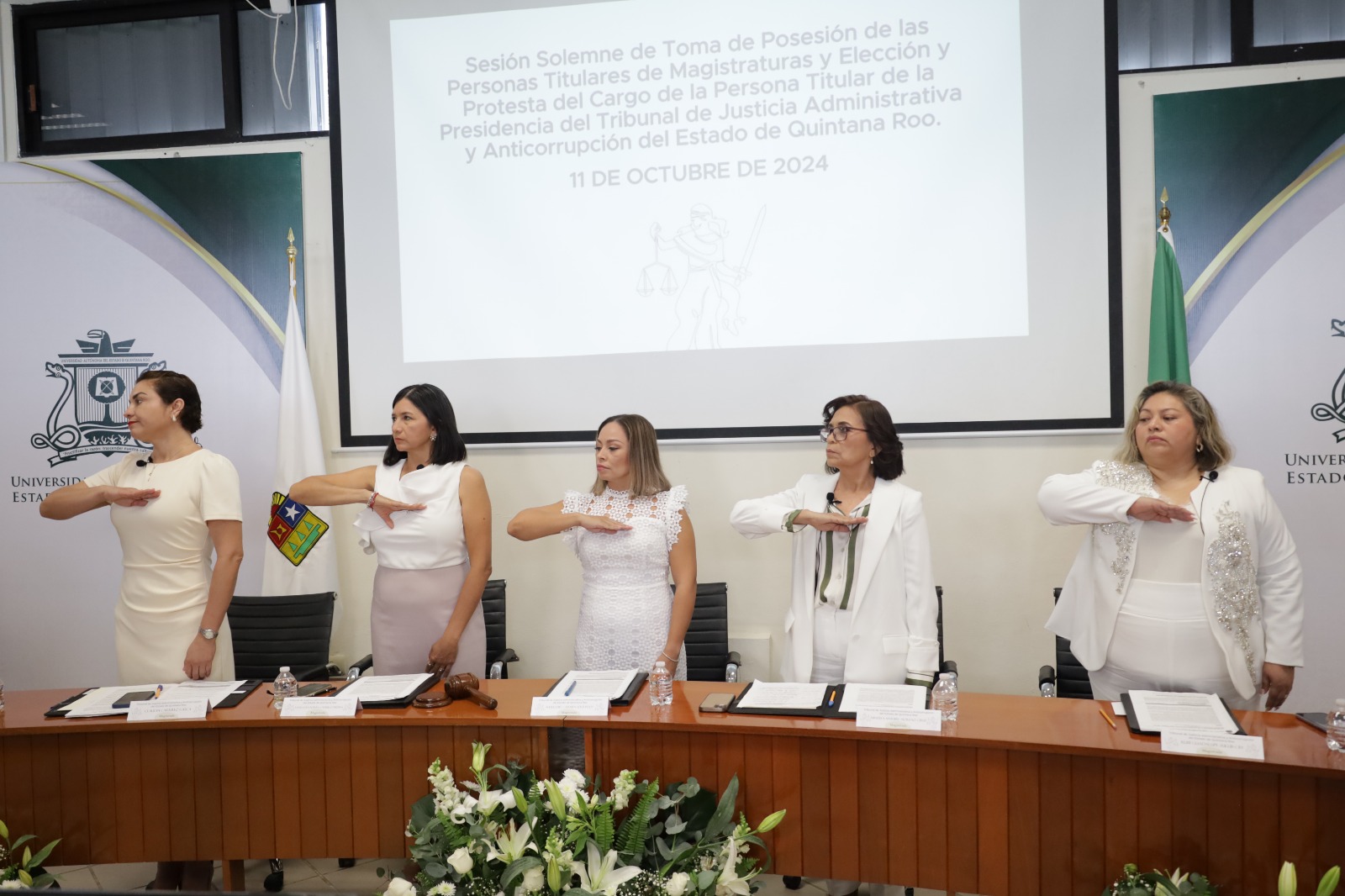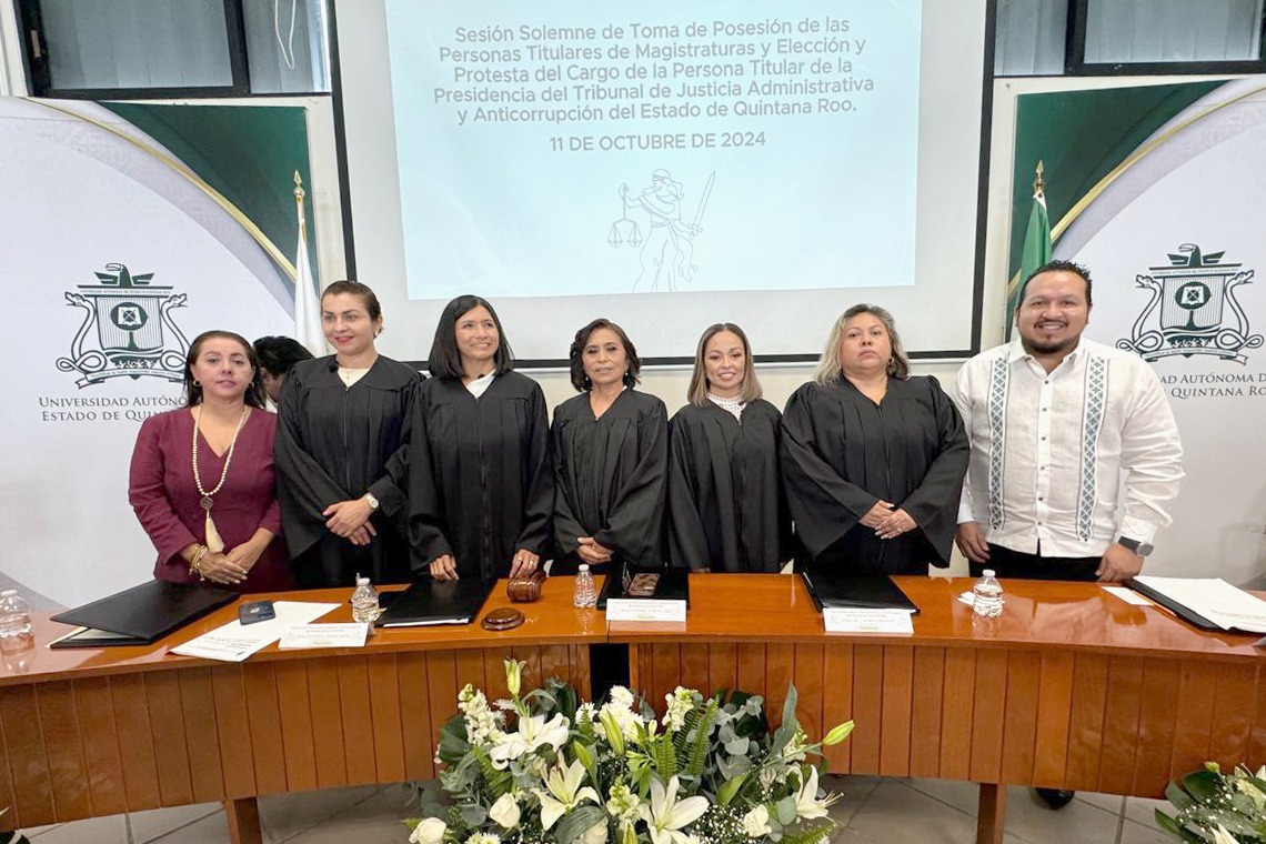 El pasado 9 de octubre, el Congreso del Estado le tomó protesta a Mayra San Román Carrillo Medina, Nayeli del Carmen Solís Poot, Claudia Carrillo Gasca, Rubí Guadalupe Sulub Chi y a Minerva Marybel Moreno Cruz como magistradas del nuevo Tribunal de Justicia Administrativa y Anticorrupción (TJAyA) y este día, se llevó a cabo la imposición de Toga representativa y designación de quien presidirá este órgano por los próximos 5 años y las salas ordinarias de Chetumal, Playa del Carmen y Cancún.