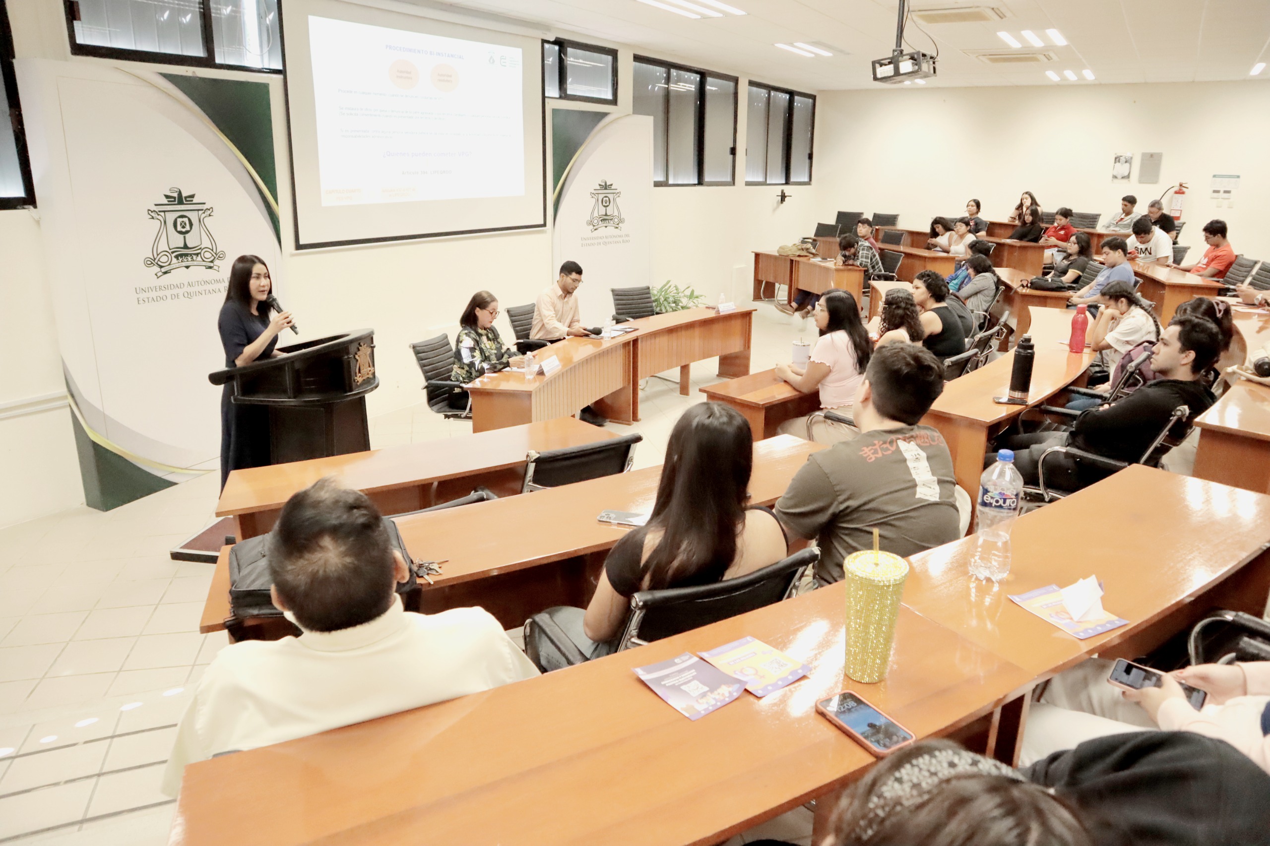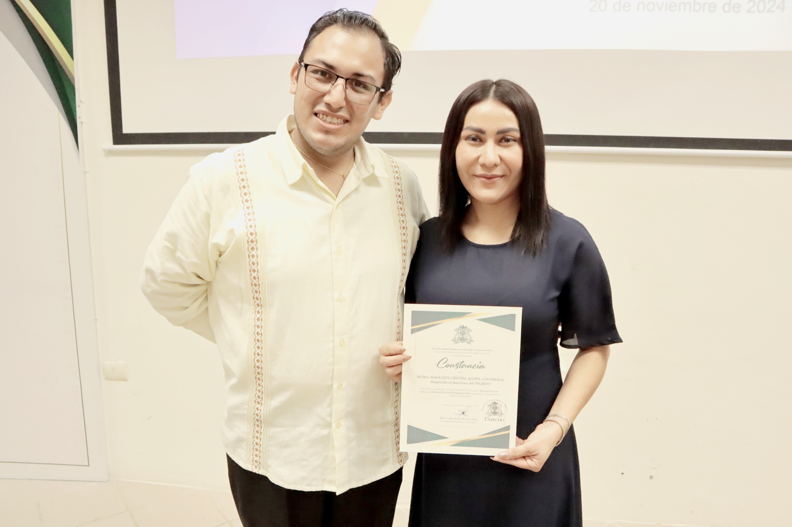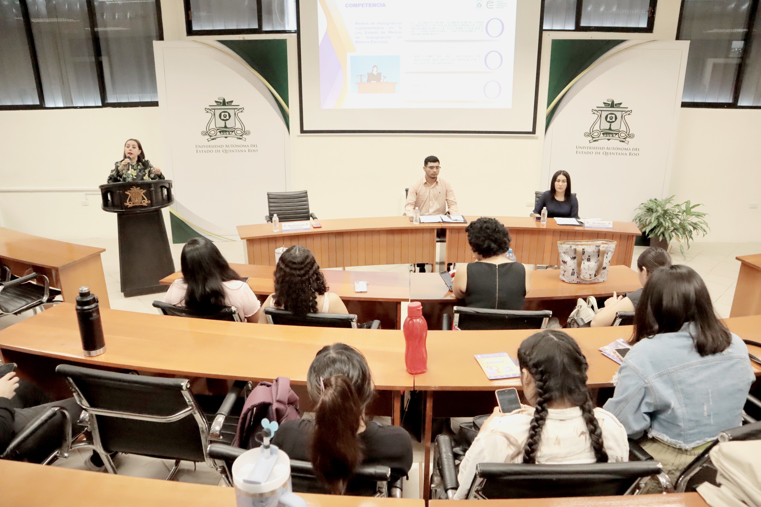 Chetumal, Quintana Roo a 20 de noviembre de 2024.- En el marco de la Semana del Derecho, así como de los “16 días de activismo contra la violencia de género”, el Tribunal Electoral de Quintana Roo (TEQROO), en coordinación con la Universidad Autónoma del Estado de Quintana Roo (UQROO), realizaron el Panel “Justicia Electoral: Conoce al Tribunal Electoral de Quintana Roo”, en el cual participaron como ponentes las Magistradas en Funciones, Maogany Crystel Acopa Contreras y María Sarahit Olivos Gómez.