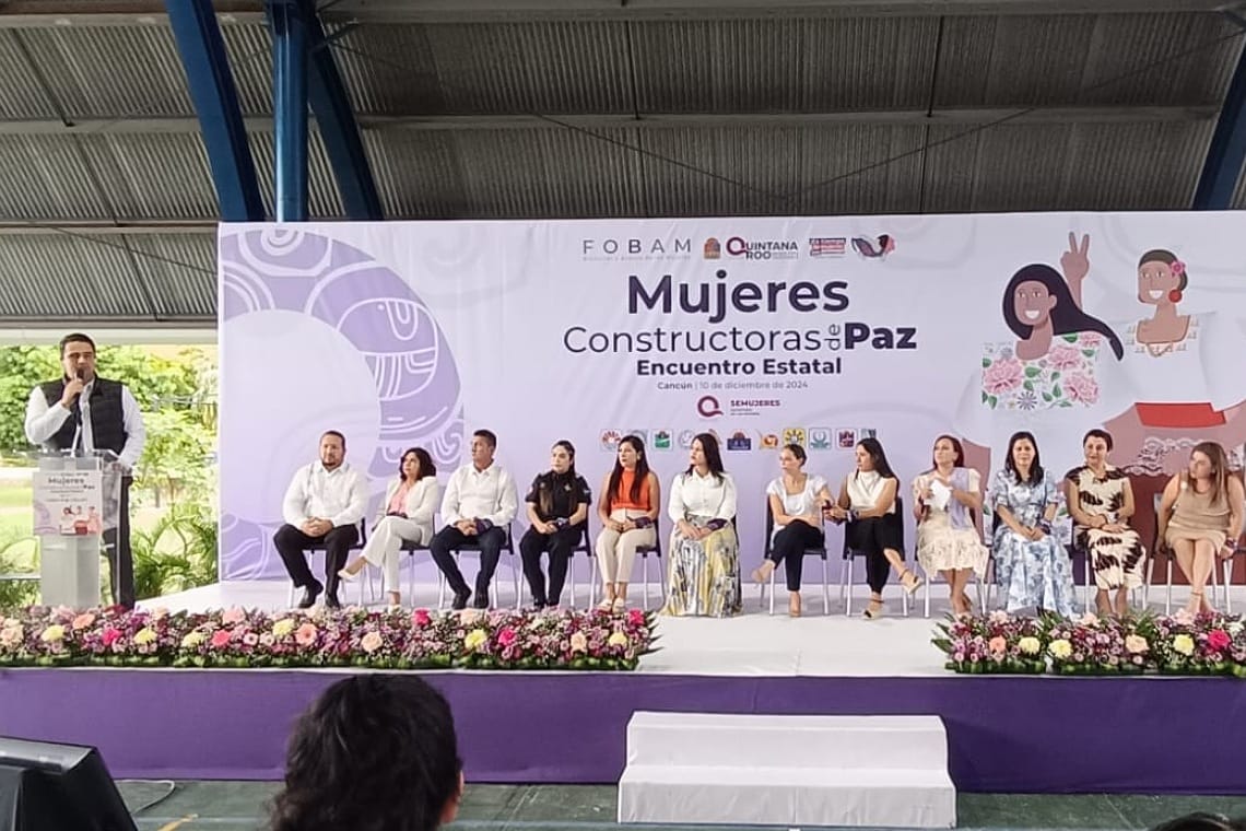 Cancún, Quintana Roo a 10 de diciembre de 2024.- El Magistrado Presidente del Tribunal Electoral de Quintana Roo (TEQROO), Sergio Avilés Demeneghi, asistió al acto protocolario del “Encuentro Estatal de Redes de Mujeres Constructoras de Paz”, evento que presidió la Secretaría de las Mujeres (SEMUJERES), Esther Burgos Jiménez, en el Domo de la Universidad Tecnológica.