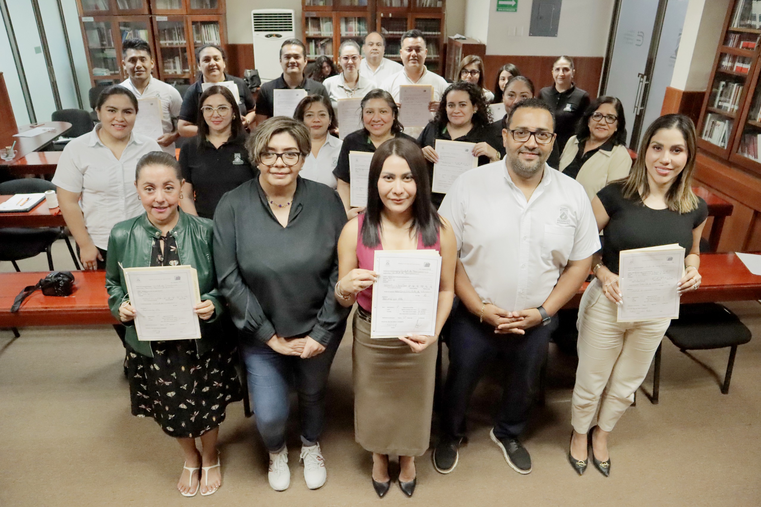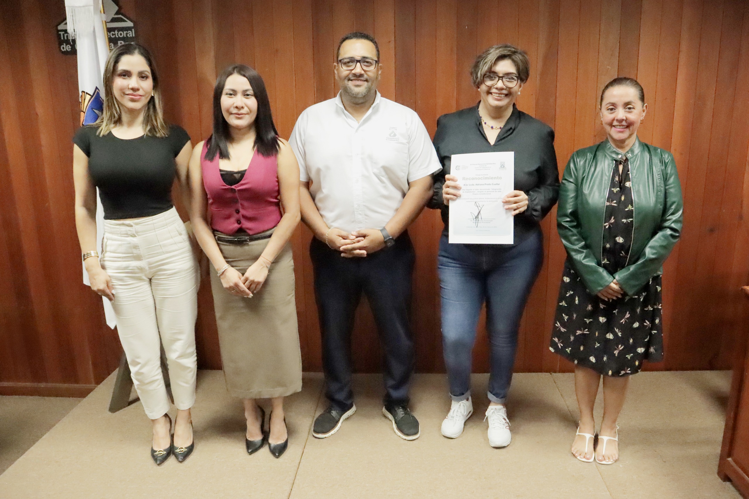 Al finalizar, las Magistradas en Funciones, Maogany Crystel Acopa Contreras y María Sarahit Olivos Gómez, fueron las encargadas de entregar el reconocimiento a la ponente, acompañadas de la Titular del Órgano Interno de Control (OIC), Ilse Berenice Cossío Lugo y el Encargado de la Coordinación de Archivo Institucional, Roberto Delfín Zamudio.