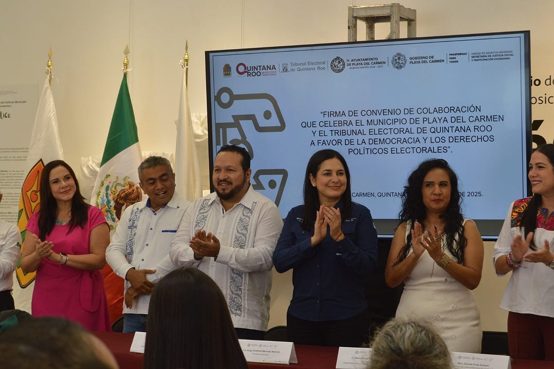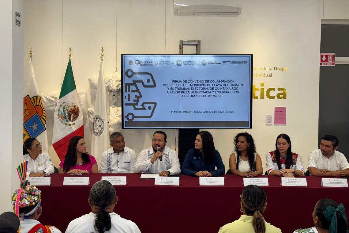 Playa del Carmen, Quintana Roo, 12 de junio de 2025.– El Tribunal Electoral de Quintana Roo (TEQROO) y el Ayuntamiento de Playa del Carmen firmaron un Convenio de Colaboración para fortalecer la democracia y los derechos político-electorales de la ciudadanía.