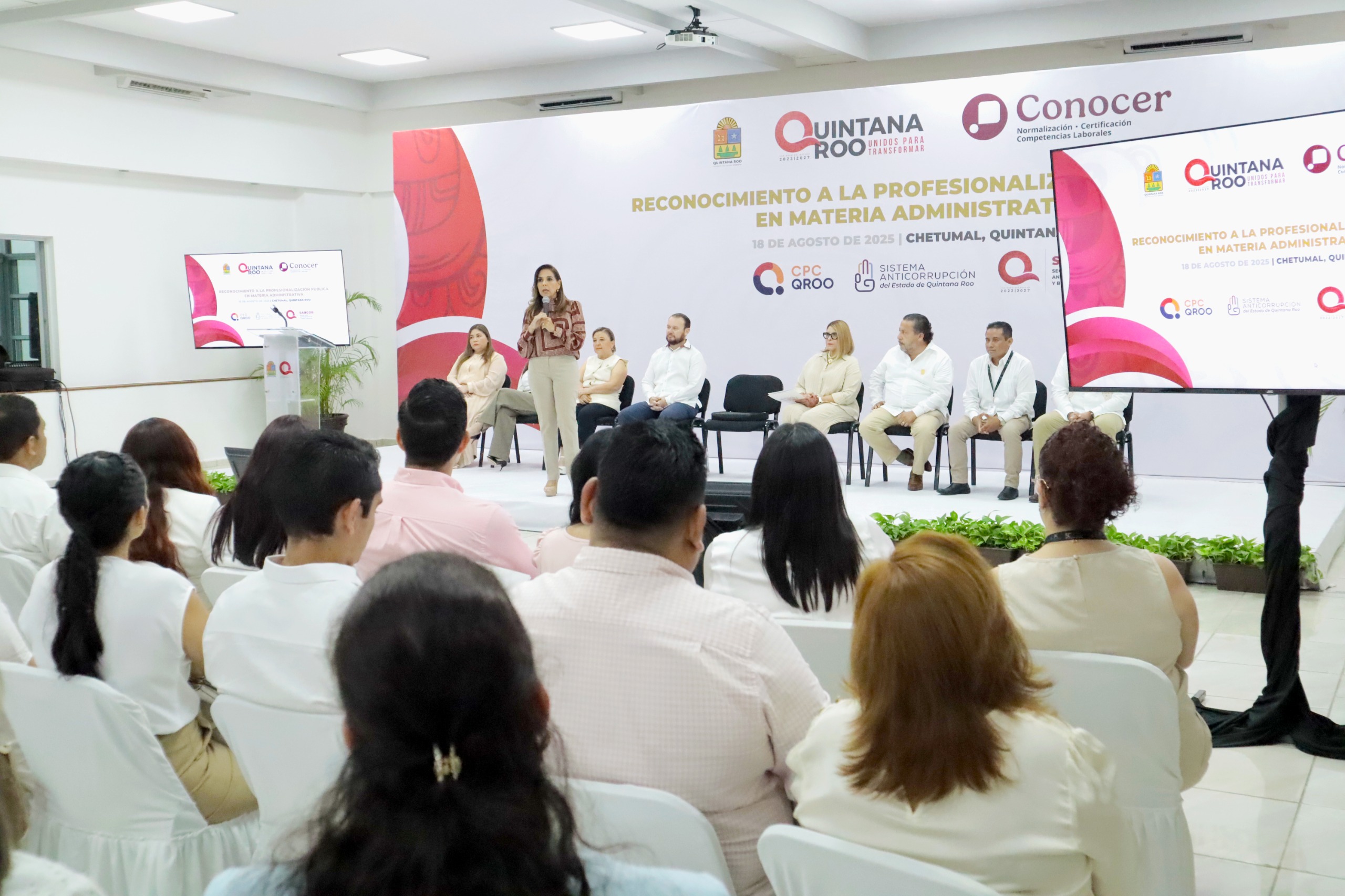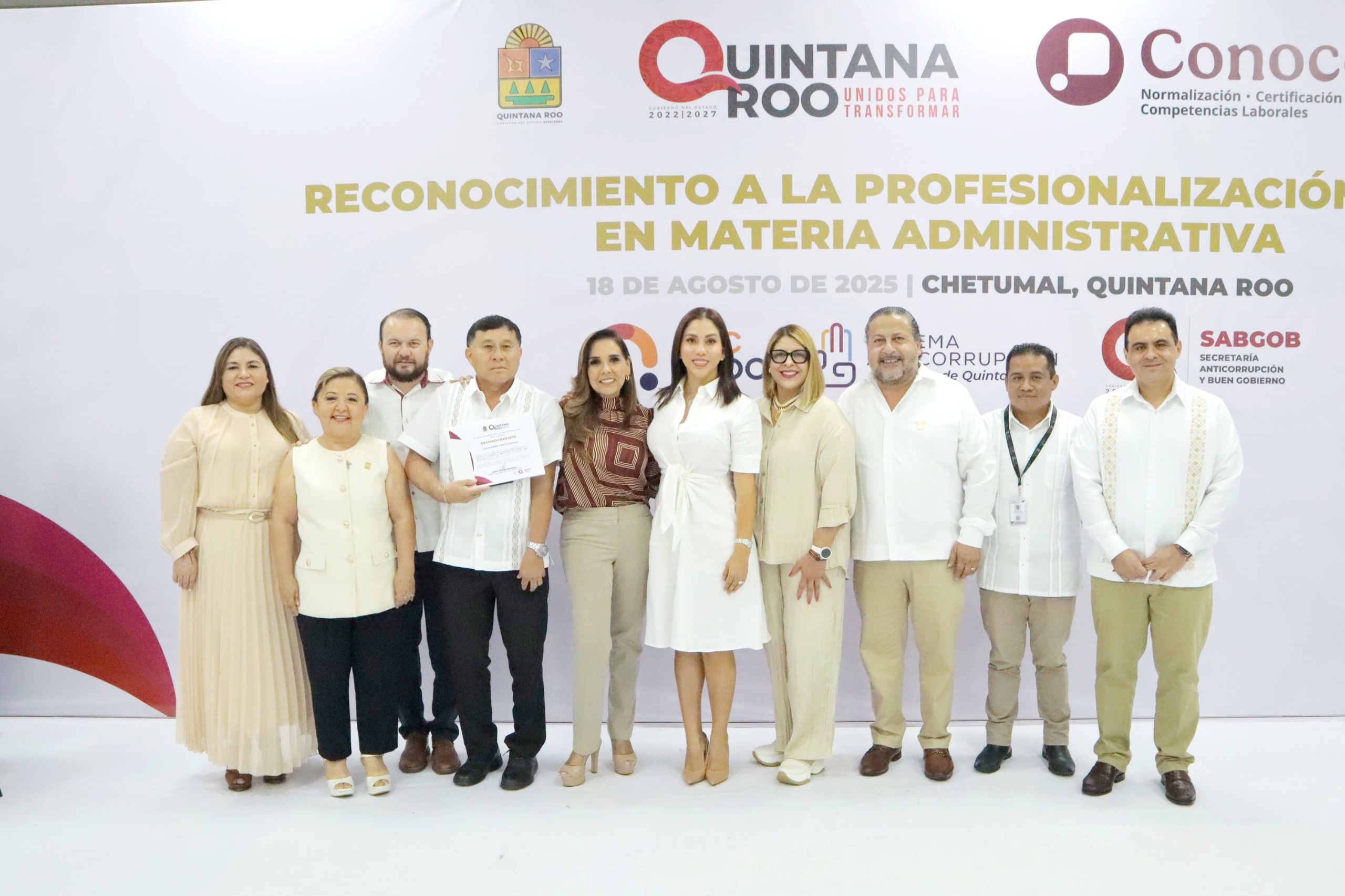 Chetumal, Quintana Roo, a 18 de agosto de 2025.- Personal del Órgano Interno de Control (OIC) del Tribunal Electoral de Quintana Roo (TEQROO) recibió un reconocimiento por su certificación en el Estándar de Competencia EC1556: “Realización de Acciones de Investigación de Responsabilidad de Faltas Administrativas”, durante el evento “Reconocimiento a la Profesionalización Pública en Materia Administrativa”, celebrado en el Auditorio de la Escuela Judicial del Poder Judicial del Estado de Quintana Roo.