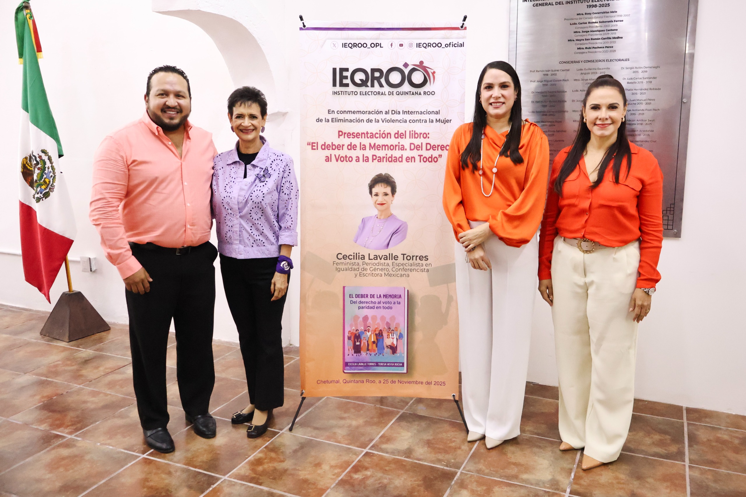 Chetumal, Quintana Roo, a 25 de noviembre de 2025.- El Magistrado Presidente del Tribunal Electoral de Quintana Roo (TEQROO), Sergio Avilés Demeneghi, junto con las Magistradas Claudia Ávila Graham y Thalía Hernández Robledo, asistieron a la presentación del libro “El deber de la memoria. Del derecho al voto a la paridad en todo”, en el marco de la conmemoración del Día Internacional de la Eliminación de la Violencia contra la Mujer.