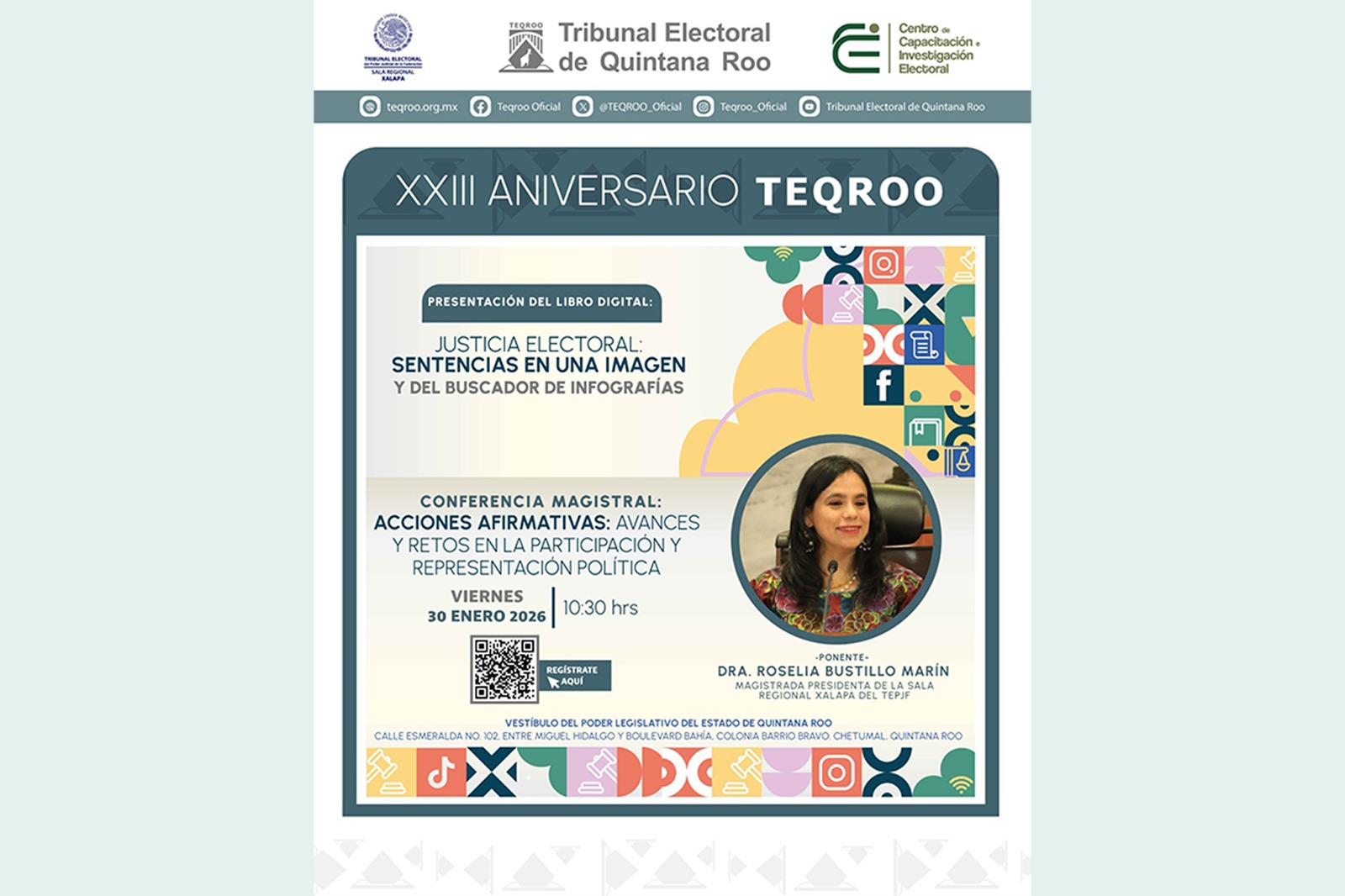 Chetumal, Quintana Roo, a 22 de enero de 2026.- En el marco de su XXIII Aniversario, el Tribunal Electoral de Quintana Roo (TEQROO) realizará una ceremonia conmemorativa en la que se dictará una conferencia magistral y se llevará a cabo la presentación del Buscador de Infografías del libro digital “Justicia Electoral: Sentencias en una imagen”, reafirmando así su compromiso con la legalidad, la justicia electoral y la protección de los derechos político-electorales de la ciudadanía.