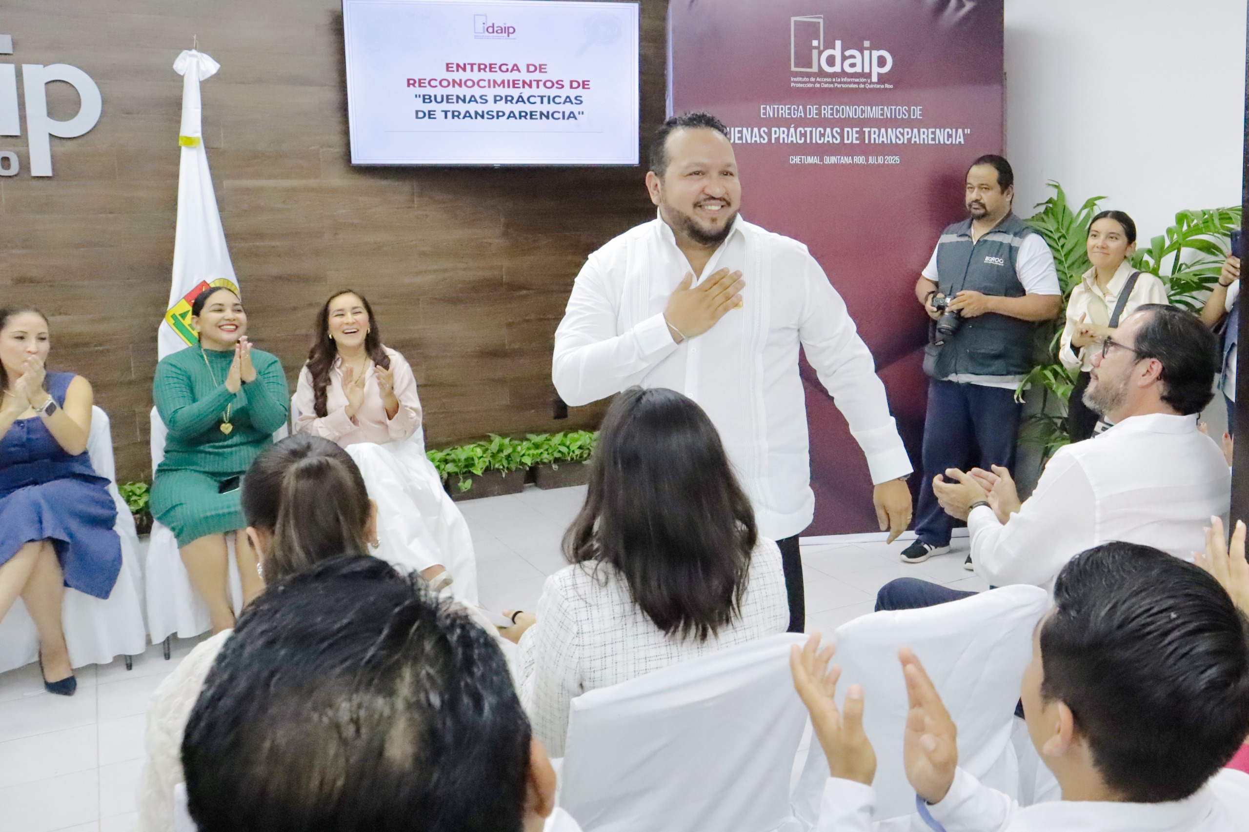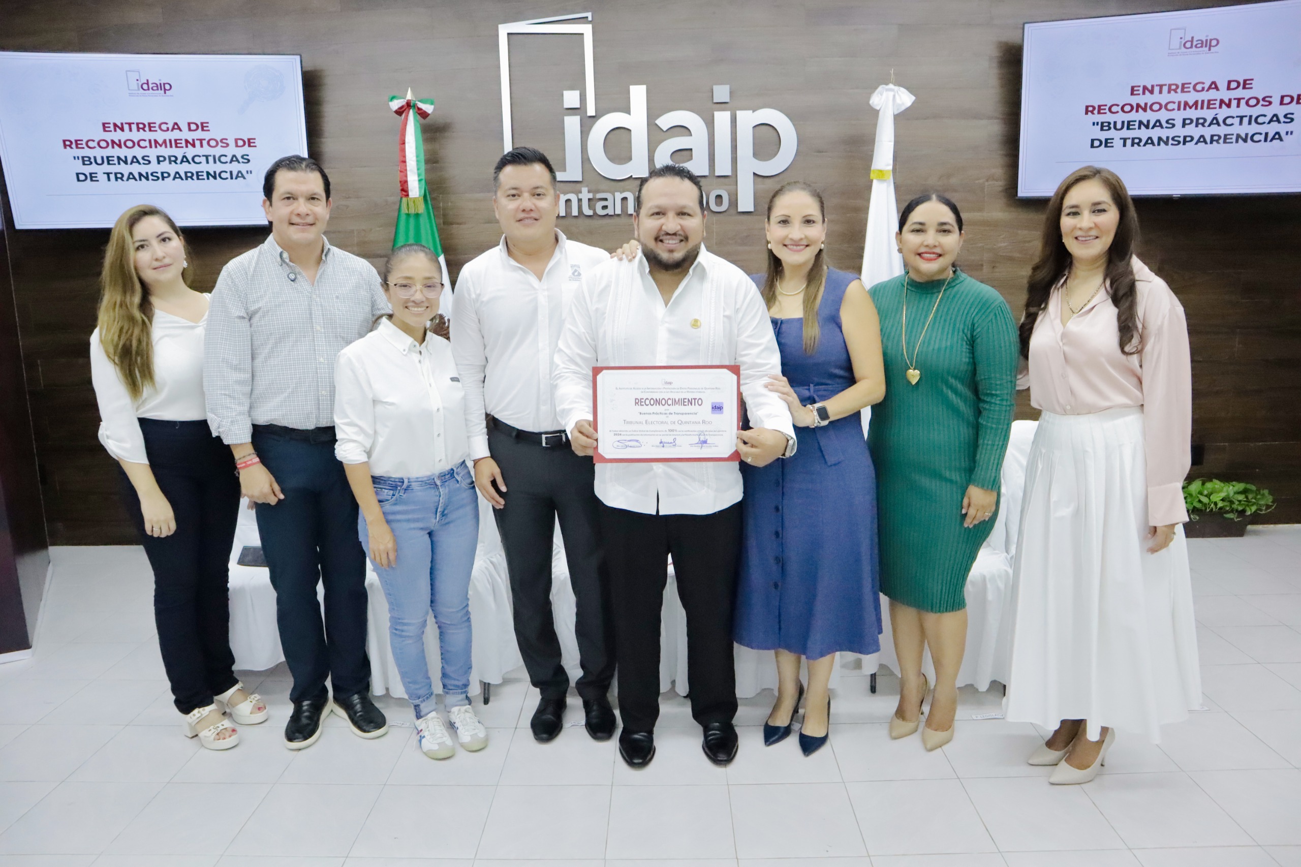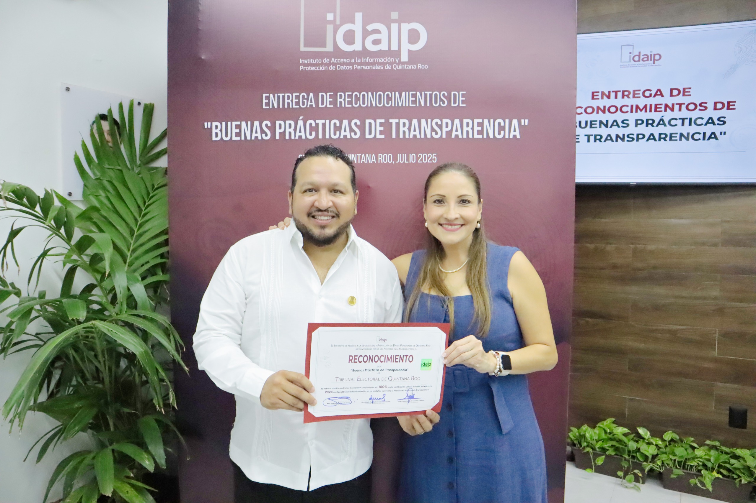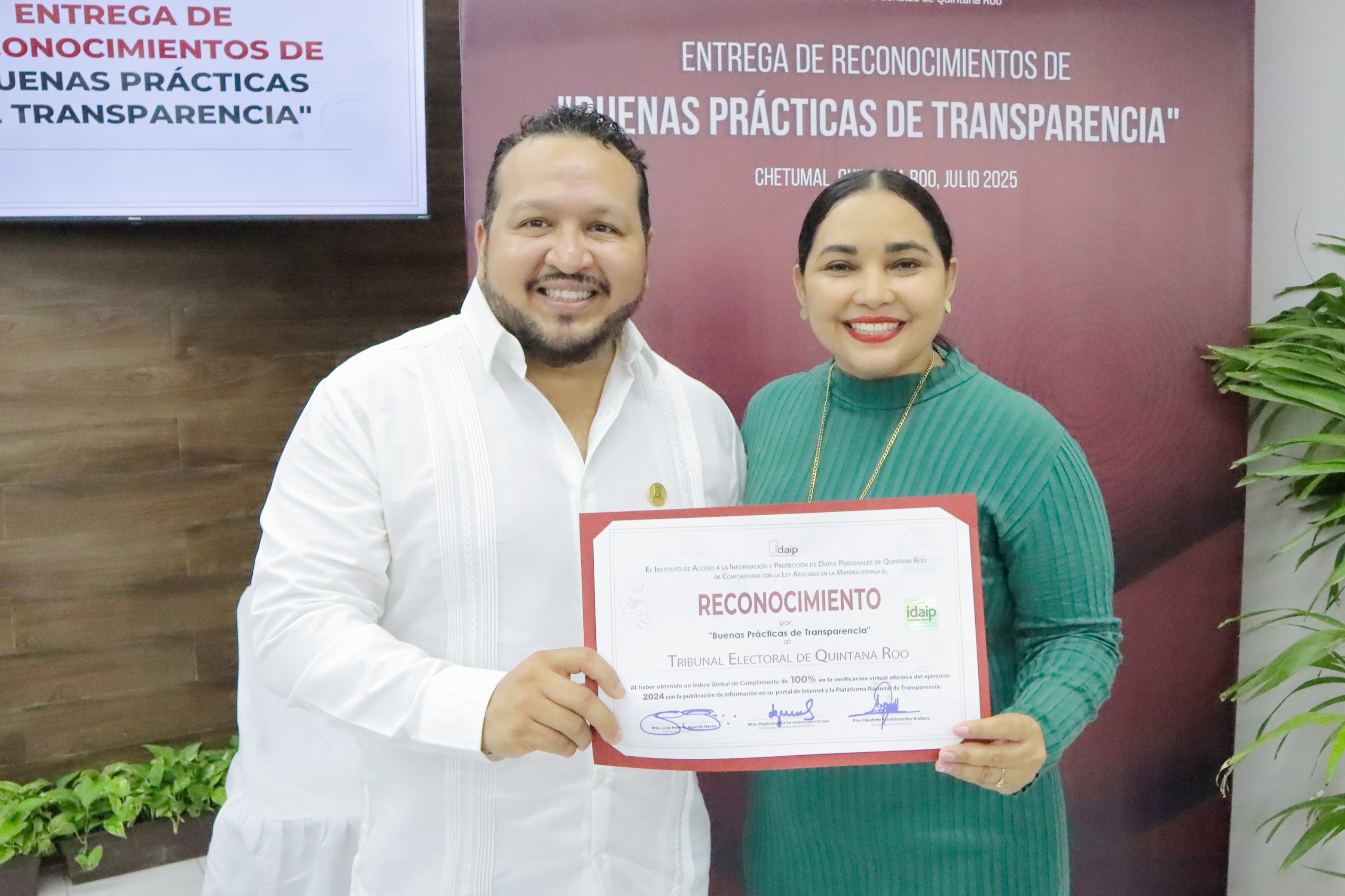 El reconocimiento por “Buenas Prácticas de Transparencia” fue entregado al Magistrado Presidente del TEQROO, Sergio Avilés Demeneghi, por parte del Instituto de Acceso a la Información y Protección de Datos Personales de Quintana Roo (IDAIPQROO), en el marco de una ceremonia institucional.