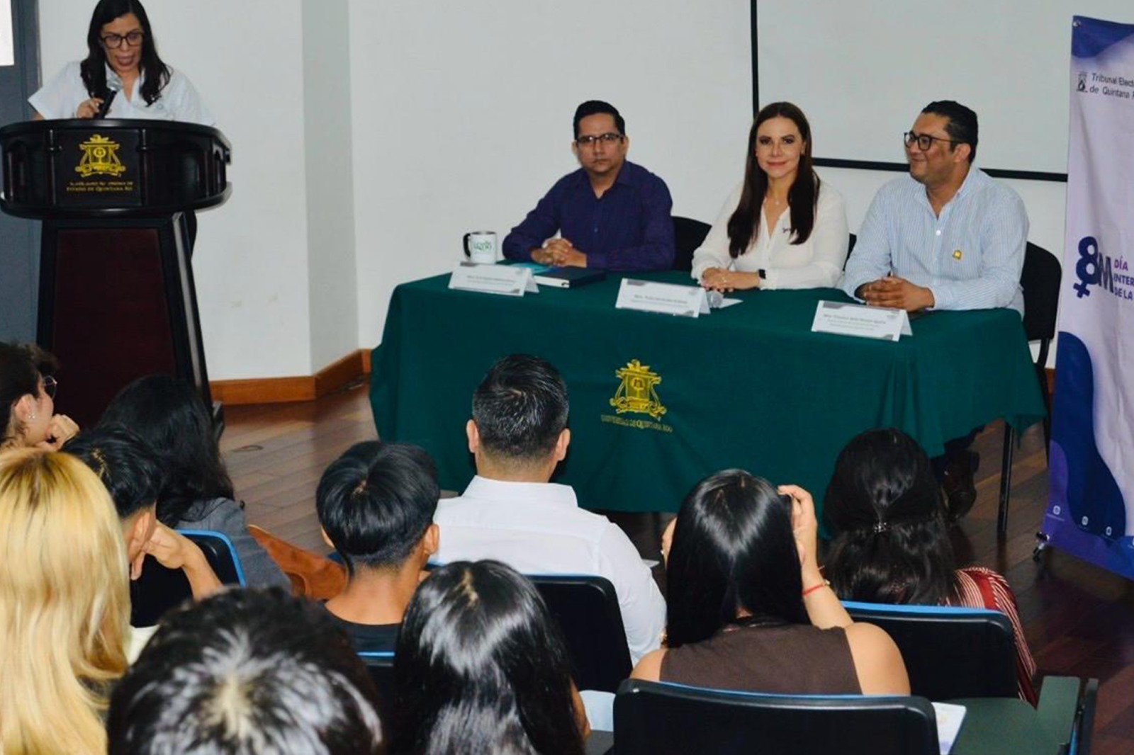 Playa del Carmen, Quintana Roo, 12 de marzo de 2026.- En el marco del #8M, Día Internacional de la Mujer, la magistrada del Tribunal Electoral de Quintana Roo (TEQROO), Thalía Hernández Robledo, impartió la plática “Los derechos político-electorales de las mujeres” a estudiantes de la Universidad Autónoma de Quintana Roo (UQROO), campus Playa del Carmen, evento que contó con la presencia de la magistrada Claudia Ávila Graham.