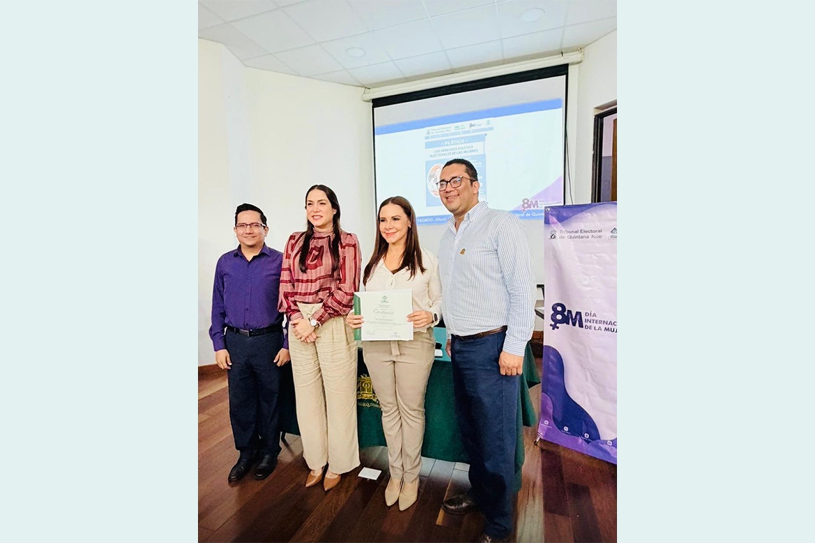 La plática fue organizada por el Tribunal Electoral de Quintana Roo, a través de la Comisión de Igualdad de Género, como parte de las acciones conmemorativas del Día Internacional de la Mujer. Al finalizar el evento, la institución educativa entregó un reconocimiento a la magistrada Thalía Hernández Robledo por su participación y aportación académica.