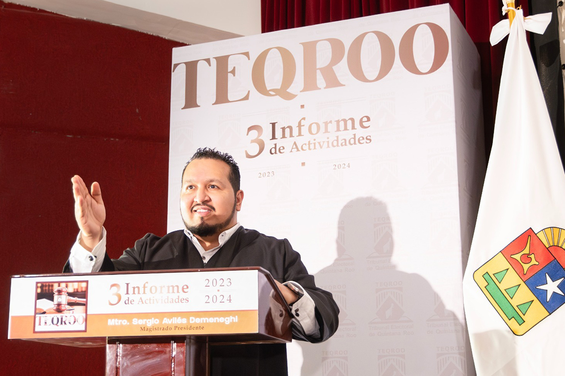 Chetumal, Quintana Roo a 25 de septiembre de 2024.- El Magistrado Presidente del Tribunal Electoral de Quintana Roo, Sergio Avilés Demeneghi destacó en su Tercer Informe de Actividades 2023-2024, que el pasado 2 de junio en Quintana Roo se tuvo la elección más incluyente que ha tenido la entidad y en consecuencia, hoy por hoy, se cuenta con una representación efectiva forjada en un camino hacia una democracia justa, igualitaria e incluyente, pero sobre todo garantizando una justicia abierta, que permite fortalecer la confianza ciudadana.