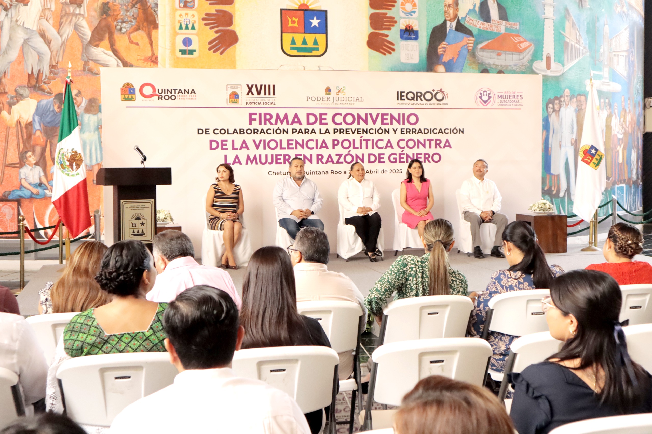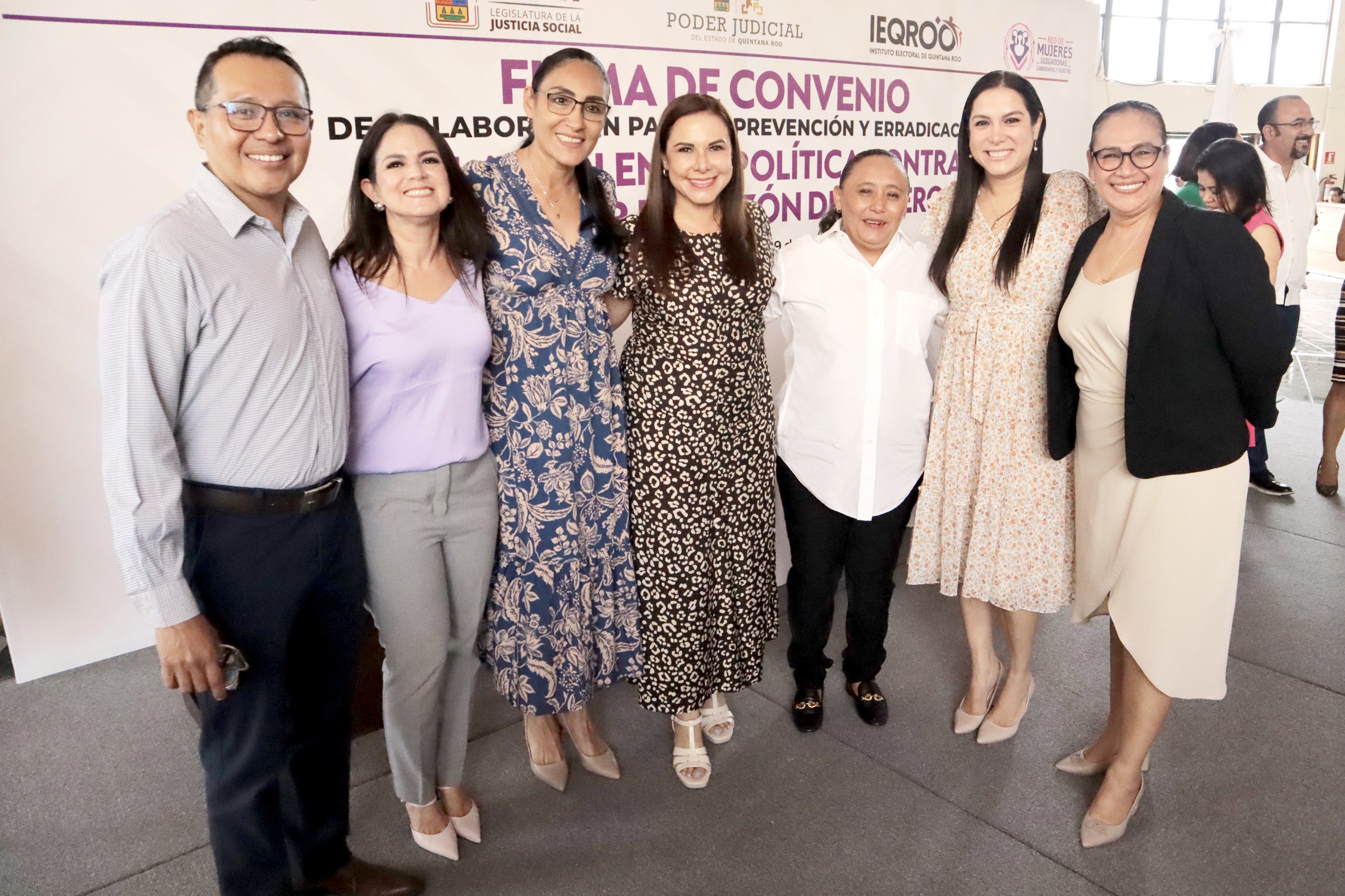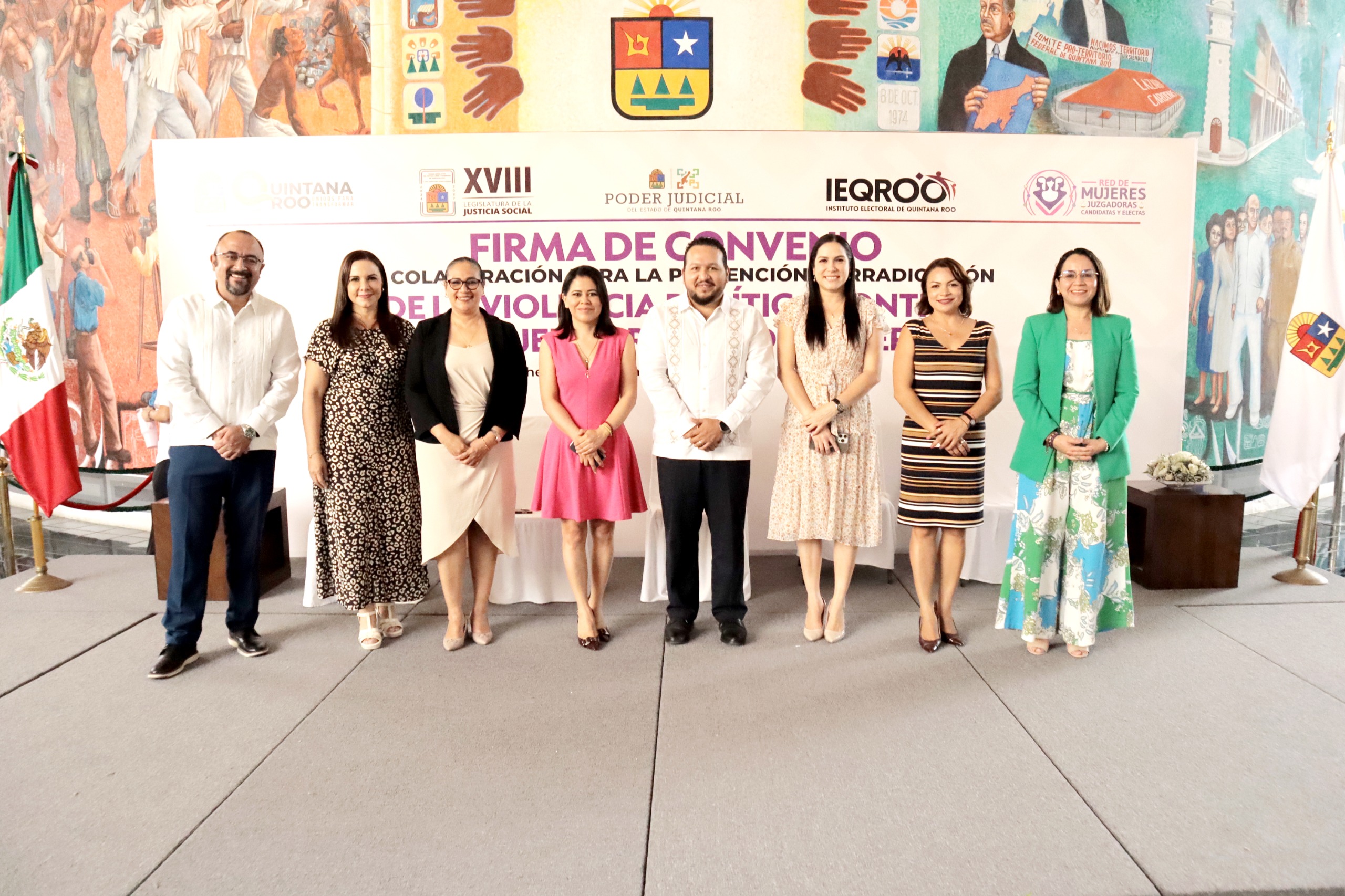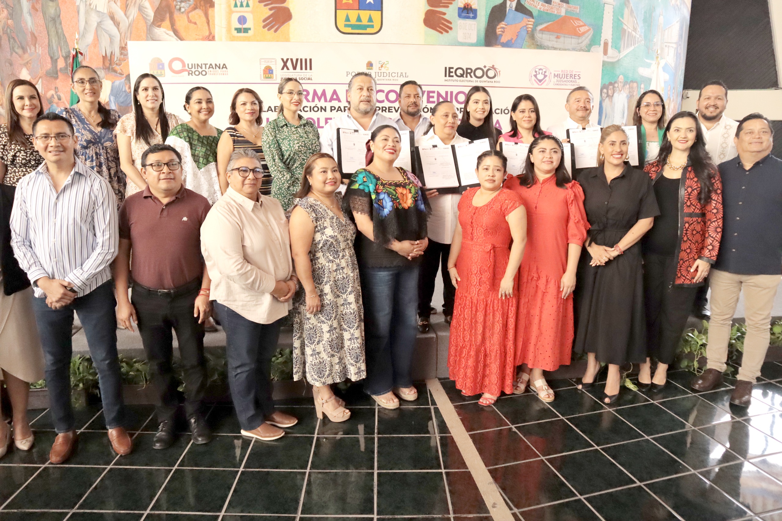 El evento tuvo lugar en el vestíbulo del Congreso del Estado, donde suscribieron dicho convenio la Secretaria de Gobierno, María Cristina Torres Gómez; el Presidente de la Junta de Gobierno y Coordinación Política de la XVIII Legislatura del Congreso del Estado, Jorge Arturo Sanén Cervantes; el Magistrado del Tribunal Superior de Justicia del Estado y Director de la Escuela Judicial, Ángel Ysidro Quintal Quintal y la Consejera Presidenta del Instituto Electoral de Quintana Roo, Rubí Pacheco Pérez.