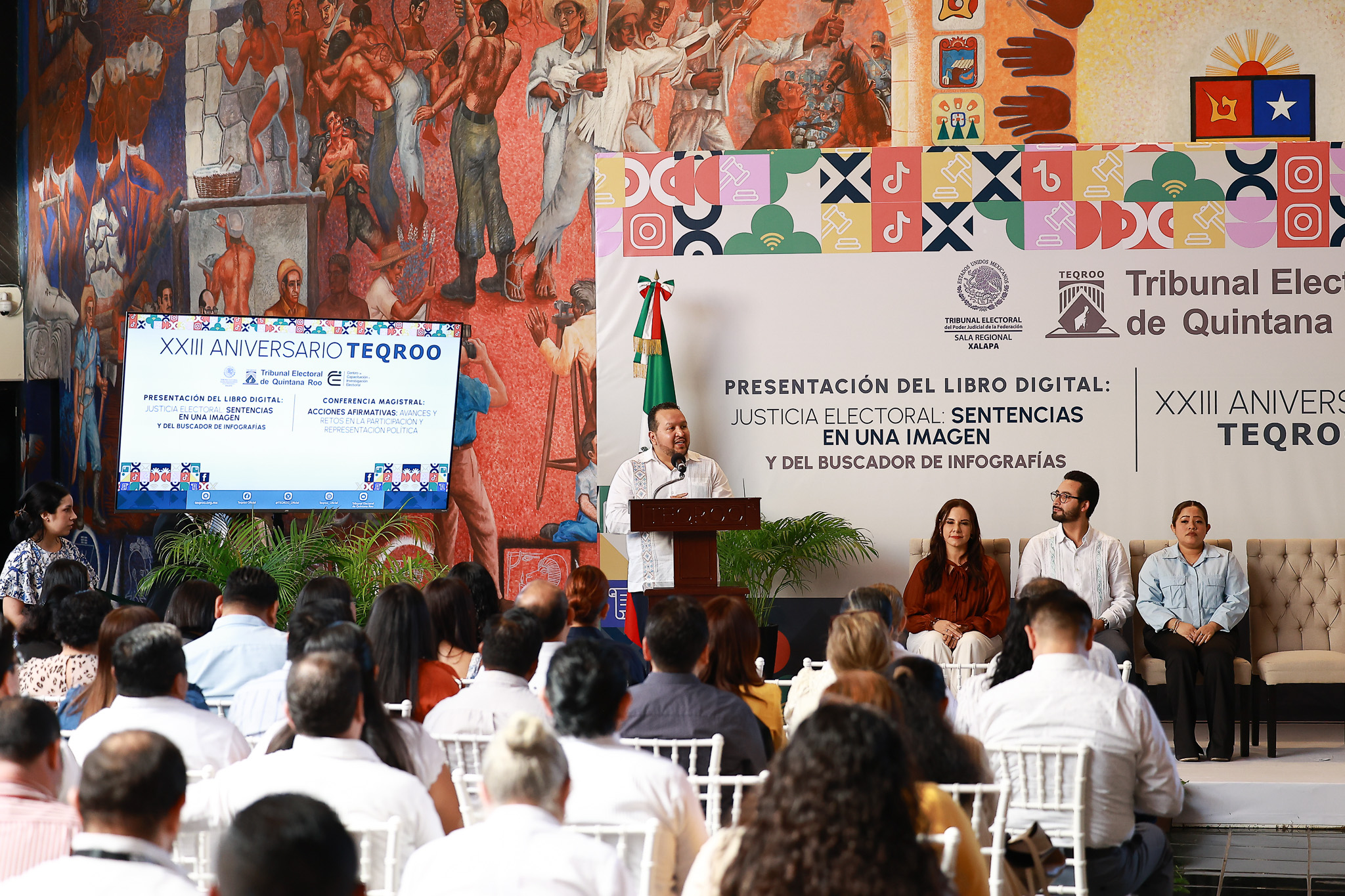Chetumal, Quintana Roo, a 30 de enero de 2026.- El Tribunal Electoral de Quintana Roo (TEQROO) conmemoró su XXIII Aniversario con una ceremonia en la que se presentó el libro digital “Justicia Electoral: Sentencias en una Imagen” y su Buscador de Infografías, así como la Conferencia Magistral “Acciones afirmativas: avances y retos en la participación y representación política”, a cargo de Roselia Bustillo Marín, Magistrada Presidenta de la Sala Regional Xalapa del Tribunal Electoral del Poder Judicial de la Federación (TEPJF).